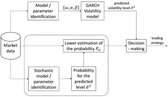 This block diagram represents the necessary data and information flows, as well as the system inputs, outputs, and the operational sub-modules. The given sub-modules are necessary for the calculation of the predicted volatility levels and for the evaluation of the statistical estimation (22). The output of the presented block diagram constitutes a final trading decision. The current market data, as well as the involved volatility prediction and statistical probability of the levels, can be visualized by the designed module.