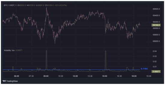We now use the AI NEWS methodology mentioned above and depict (Figure 2) the market dynamics, the volatility prediction profile, and the corresponding statistical probability level for the concrete crypto trading pair BTC/USDT (date: 10 April 2024).