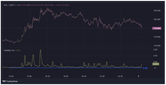 Let us also apply the developed predictive statistical analysis to an alternative example; namely, to the trading pair SOL/USDT (date: 09/04/2024). The corresponding market dynamics, volatility prediction profile, and the calculated statistical probability level for this pair are shown in Figure 3.