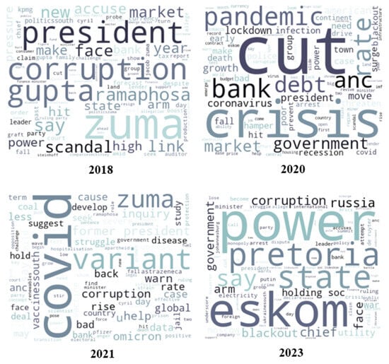 Figure 1 illustrates how the narratives extracted from the Financial Times have changed over time. In 2018, the focus was around political scandals and then shifted in 2020 to the pandemic and global crisis. News around the pandemic still featured in 2021. The 2023 news shifted to the electricity crisis and the impact of it on the economy.