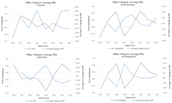 The average PD was derived across all banks to obtain a view on the general trend, by year, for the given asset class. In Figure 2, the average log changes of the PDs are plotted against the average sentiment score for the year, which were extracted from the news sources. Only the news sources with the strongest relationship with the change in PDs are shown. All the plots show the expected negative relationship, thus indicating that more positive news are related to lower systemic risk and thus lower PDs. The SARB MPC were found to have a strong relationship with retail mortgages and revolving retail; global risks highlighted by the WEF reports were found to be related to corporates; and the Financial Mail news were found to be strongly related to the behavior observed for the retail SMEs.