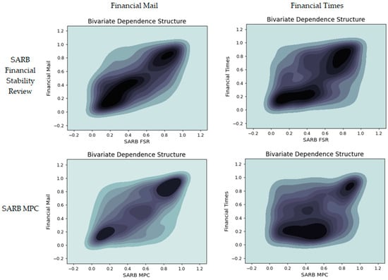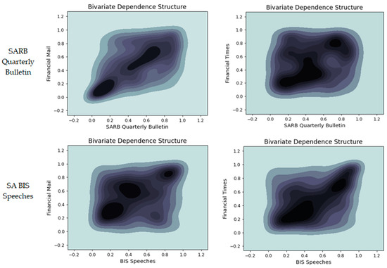 The causal effects of central bank communication on general economic narratives were tested by calculating the crosscorrelation function at monthly lags out to one year based on data from January 2016 to March 2023. Figure 3 shows a matrix of the bivariate dependence structures between the South African central bank communications and other news sources, thus incorporating the lag where the strongest correlation is observed. The darker areas denote more observations.