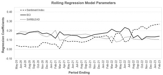 Figure 7 show the estimated regression coefficients over time. Generally the , , and consistently had statistically significant coefficients in the regression, with the weight of the sentiment index increasing over time. The estimated regression coefficients are shown in Table 6 for September 2022, thus ensuring a hold-out sample of 6 months. The individual indicators were found to be nonstationary; however, the residuals were found to be stationary as indicated by the ADF test statistic. The variance inflation factors (VIFs) indicate no issues with multicollinearity. The was included at a lag of 3 months; all other variables were included at no lag.