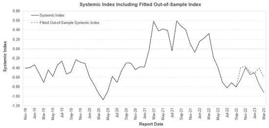 The economic systemic index was derived as per Equation (1) from the set of economic indicators {ALSI; FINI; PDI; ECOMP; PCE; PPI; CPI; BOND; USDZAR; GDP; PMI} using historical data from January 2016 to March 2023. The eigenvalues and eigenvectors from the PCA are summarized in Table 4. The first three principal components (PCs) were selected to construct the systemic index, as they explained over 80% of the total variance. The first PC captures the stock market with some weight to inflation and economic activity; the second PC has most weight to inflation, interest rate, and currency; and the third PC is heavily weighted to economic activity.