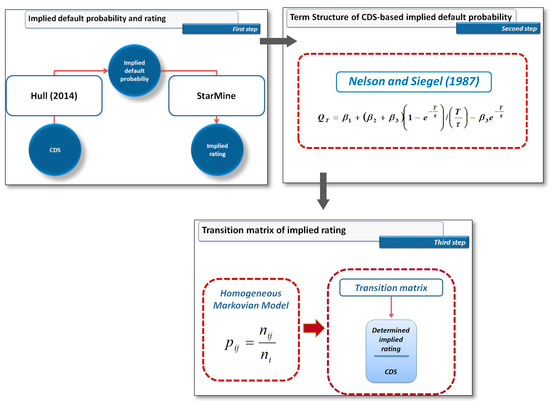 The methodology of this paper consisted of three steps. The first step aimed to determine the implied default probability and the implied rating from the observed CDS spreads. In the second step, we estimated the term structure of the CDS-based implied default probability. Finally, the third step involved predicting the level of credit risk by estimating the transition matrix of the CDS-based implied rating. These three steps are illustrated in Figure 1.