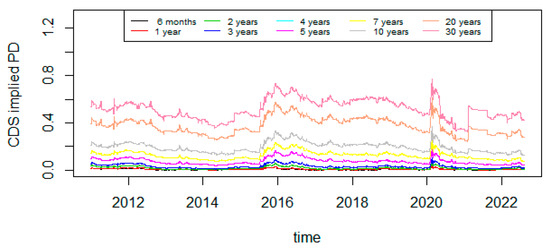 Credit risk is the risk that a borrower defaults on their debt obligations. Studying this risk is crucial for financial stability, guiding investment decisions and informing risk management strategies. Credit risk assessments can be performed by estimating default probability, which can be estimated using either historical data from rating agencies or market data, such as stock prices, bond prices or CDS spreads (Merton 1974; Jarrow 2001; Hull et al. 2004). According to Annaert and Ceuster (2000), default probabilities based on ratings from agencies may not accurately reflect the true level of risk. Studies by Flannery et al. (2010), Cizel (2013), Jacobs et al. (2016), Rodríguez et al. (2019), Abid et al. (2020) and Abid and Fathi (2023) indicate that CDS spreads provide more precise information than credit ratings. Furthermore, Dwyer et al. (2010) demonstrated that CDS spreads are more effective in predicting credit risk, with default probabilities derived from CDS spreads being more realistic than those based on other financial data. In addition, Augustin et al. (2022) showed a close relation between CDS quotations and credit risk; also, price and quantity fluctuations of sovereign default insurance are explained by sovereign credit risk. Therefore, in this article, we use the Hull (2014) model to calculate sovereign implied default probabilities from sovereign CDS spreads.