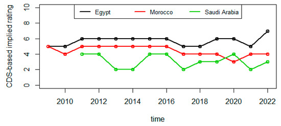 The persistent growth of external debt in the MENA region has raised concerns about the governments’ ability to service their debt. According to World Bank statistics, the total external debt of countries in this region increased from USD 182 billion in 2009 to USD 225 billion in 2014, then reaching USD 350 billion in 2018 and USD 417 billion in 2021. High levels of debt highlight the level of sovereign credit risk, which can be measured using market data such as bond and credit default swap spreads or historical data provided by rating agencies (Hull et al. 2004; Longstaff et al. 2011; Paret and Dufrénot 2015; Rodríguez et al. 2019). The political crisis in most Arab countries in 2011, the COVID-19 health crisis and the war in Ukraine have provided a window of opportunity for researchers to challenge former assumptions about the adequacy of conventional rating and risk assessment methodologies (Piccolo and Shapiro 2022). In fact, previous researchers have shown that CDSs reflect information more precisely than credit rating and are effective in predicting credit risk and that the credit risk measure withdrawn from the CDS spread is more real than the credit risk measure withdrawn from other market data (Jarrow et al. 1997; Zhu 2006; Flannery et al. 2010; Dwyer et al. 2010; International Monetary Fund 2013; Jacobs et al. 2016; Rodríguez et al. 2019; Abid et al. 2020; Abid and Fathi 2023). The implied ratings calculated from CDS spreads are more responsive to market conditions, as ratings published by rating agencies tend to remain relatively stable even during periods of increased risk, such as the COVID-19 pandemic and the war in Ukraine. Additionally, implied ratings better reflect current information than ratings provided by agencies (Blair 2013; Vieira and Bonne 2016).