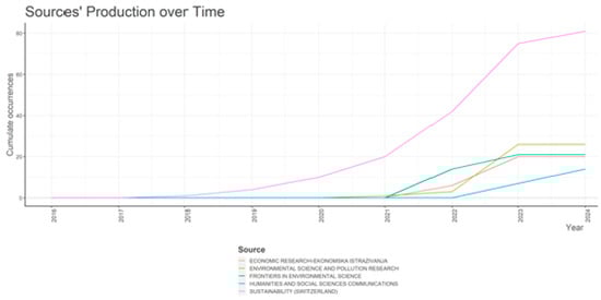 From a dynamic aspect, journals have different behaviors: all of them show a relative increase in the number of publications over time, but the rates of increase are different. The jump in publication activity during the period 2018–2024 for the first journal in the ranking—Sustainability—is huge, while the satisfactory trend of increasing publications is observed in the remaining journals later, in the period 2021–2024, but on much smoother and smaller scales (see Figure 2).