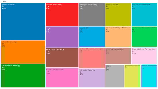 This type of analysis of publications intuitively focuses on their thematic content. To reveal the content, the keywords in the publications of the sample are used. In our sample, the total number of keywords is 1171. Bibliometrix allows the set of keywords to be “cleaned” to make them suitable for further work. This was completed by drawing up a list of words to remove. After this manipulation, the following most common keywords from the 436 documents in the sample were identified according to their frequency of occurrence: green bonds, climate change, renewable energy, green economy, and ESG. For the top 20 most common words, a word tree was created to identify their structure in the overall set of keywords, as well as a word cloud to further visualize their influence (see Figure 3 and Figure 4).