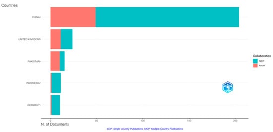An analysis of scientific production by country was conducted, and a ranking was made based on the number of published articles. Leading the ranking list with 204 publications from the sample is China, followed by the United Kingdom with 24 publications, and Pakistan with 15 publications. The top five countries/regions cover 264 of the published articles, which is approximately 61% of the total number (see Figure 5).
