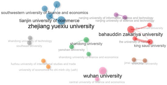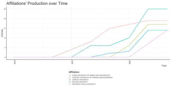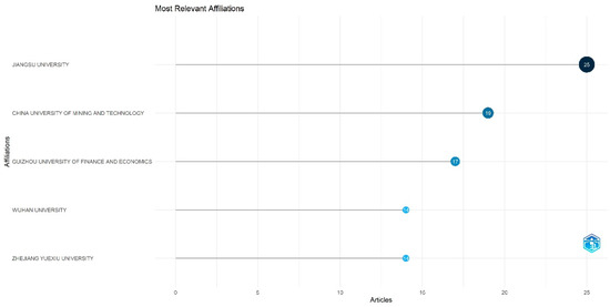 The measurement of the most relevant affiliations (institutions, universities, organizations), which involves measuring the scientific output generated by authors in the field of green finance and sustainability from a given institution, is assessed by number of publications. According to this indicator, of the 646 affiliations in the sample, Jiangsu University (Zhenjiang, China) has the largest number of articles (25), followed by China University of Mining and Technology (Xuzhou, China) with 19 articles, and Guizhou University of Finance and Economics (Guiyang, China) with 17 articles (see Figure 7).