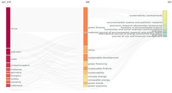 The data show that the greatest interest is in green finance. This is most prominent in scientific publications from China, Pakistan, and India, but featured to a lesser extent in other countries. It is also the subject of scientific articles published most often in the journal “Sustainability”, but is focused on less often in some of the other journals in the example.