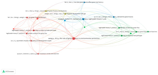 - Yellow cluster (two items)—“Green finance and environmental impact”—examining the relationship between green finance, renewable energy, and carbon intensity in selected Asian countries, as well as investigating the environmental effects of green credit policies in China (Xu and Wu 2023; Zhang et al. 2021b).
