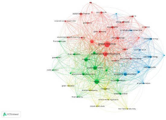 The visualization shows the formed clusters, which are colored in different colors: red, green, blue and yellow. It can be assumed that the clusters of keywords outline the conceptual structure of the researched scientific field, namely the role of green finance in sustainable development, in a substantive, thematic way.