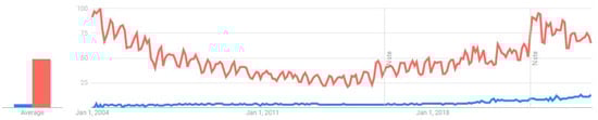 Interest over time in worldwide Google searches for the terms “green finance” (blue) and “sustainable development” (red) for the period 2004–present (source: Google Trends).