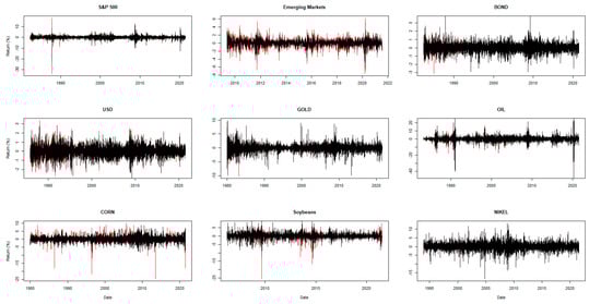 Spot and futures return plots. Note: Continuous changes in the spot and futures markets are demonstrated in black and red, respectively.