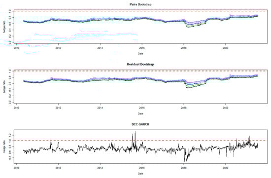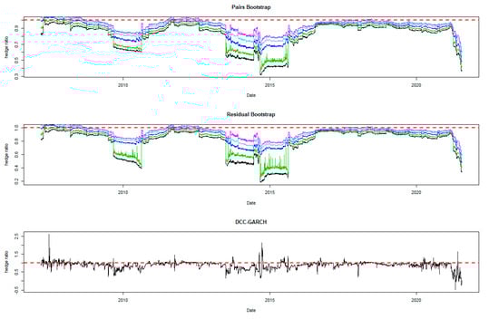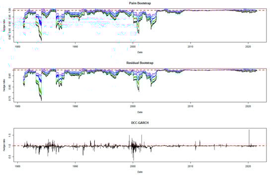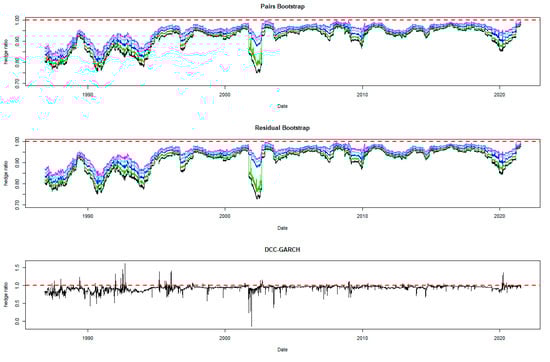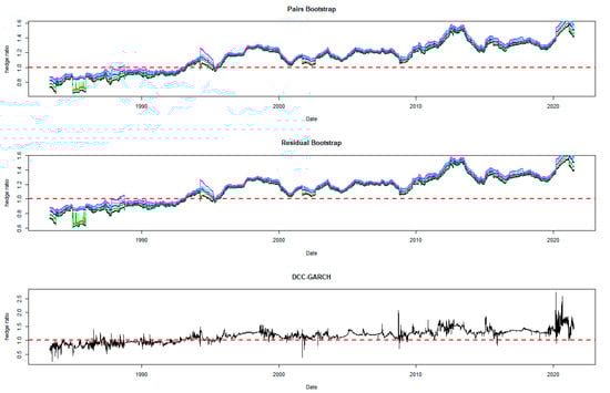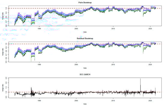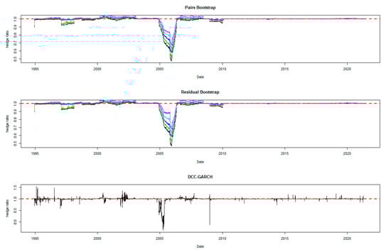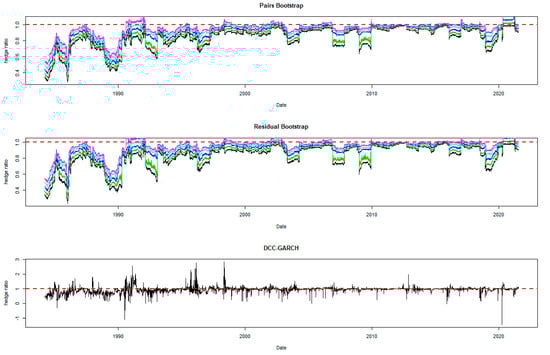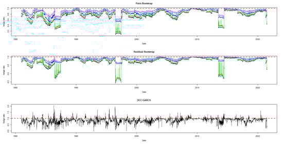 The time-varying MVHRs are shown in Figure 2, Figure 3, Figure 4, Figure 5, Figure 6, Figure 7, Figure 8, Figure 9 and Figure 10 for the included assets6. These MVHRs are generated using a moving sub-sample window of a 1-year trading period. In each figure, the bootstrap percentile-based MVHRs, using the pairs bootstrap, are reported in the top panel, while those based on the residual resampling procedure appear in the middle panel. These plots present the 95% confidence interval band within which are used for percentile-based hedging strategies. The DCC-GARCH-based MVHRs are presented in the bottom panel of the figures. As a conventional hedge, the naïve strategy is also indicated by the horizontal line at a hedge ratio of 1 in each panel for comparison.