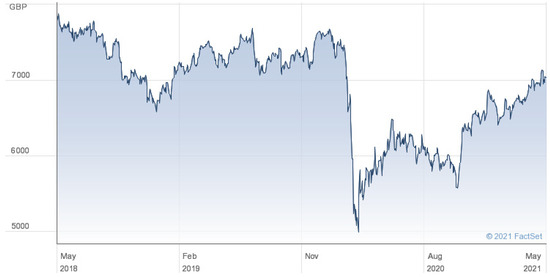When the slide started, the Dow Jones Industrial Average lost 26 per cent in four trading days (Mazur et al. 2020). This is shown in Figure 1. This was mirrored by the fall of the FT 100 Index (Figure 2). The full decline was extended over a month, and there was massive volatility (Baker et al. 2020). The fall in prices then reversed so that about half the losses were recovered over the next few months. Some individual company crashes have been similarly quick; for example, the fall in the BP stock price following the Deepwater Horizon disaster took about six weeks and was followed by some recovery. However, compared with the 1929 crash and the bursting of the dot-com bubble, the COVID-19 crash was rapid. The 1929 crash occurred over three years, and the dot-com bubble, starting in 2002, burst over two and a half years. Recovery after these crashes was also slower than that observed with COVID-19; after the 1929 crash, recovery took years, and the NASDAQ took 10 months to regain about 50 per cent of the dot.com drop.
