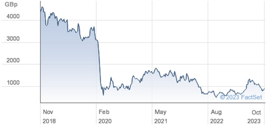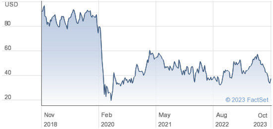 Firms that were directly impacted by pandemic restrictions fared much worse. For example, the cruise firm Carnival (Figure 3) lost about 90 per cent of its stock value in the initial slide. So did Cineworld (Figure 4) and United Airlines (Figure 5). But, like the main indexes, the stock price of these companies recovered part of the fall over the next few months, though, by the end of 2023, Carnival had declined further, and Cineworld was near zero and had filed for bankruptcy in the USA.