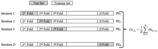 Figure 1 describes the process of D-CV where the dataset is split for D folds. Each row represents one iteration and each column represents one fold. For example, in the first iteration, the 1st fold represents the test set, whereas the remaining D − 1 folds represent the training set. In the second iteration, the 2nd fold represents the test set, and the other folds are the training set. Thus, repeat this until every D fold serves as the test set.