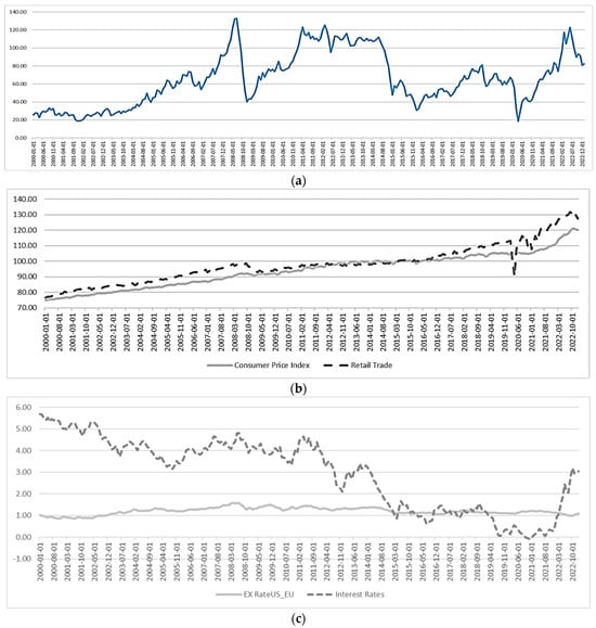 (a) The monthly crude oil prices in the European Union. (b) The consumer price index and retail trade in the European Union. (c) The monthly exchange rate and interest rates in the European Union.