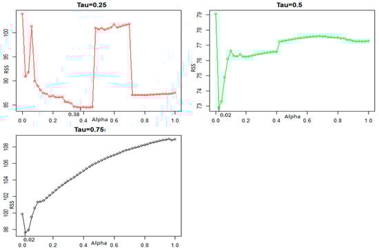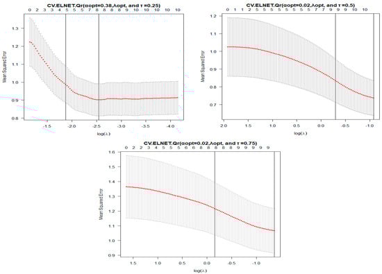 Figure 4 shows the 10-CV estimate plot of the ELNET.Qr αopt; (and and τ = 0.25, 0.50, 0.75, respectively. In each plot, the red dotted line is the mean square error () curve with one standard error band along the error bars. The -axis represents the and the -axis denotes the function. The upper horizontal line of the plot represents the numbers of nonzero regression coefficients in the model at value. The first vertical dotted lines from the right represent the point selected at a minimum of the ) rule, while the second vertical line denotes the location of the point selected at a minimum of with the one standard error rule. These two lines show the numbers of nonzero regression coefficients selected at and rules. The increase in λ value leads to a decrease in the number of non-zero coefficients in the model. Therefore, the selection of the λ is based on the optimal minimum value.