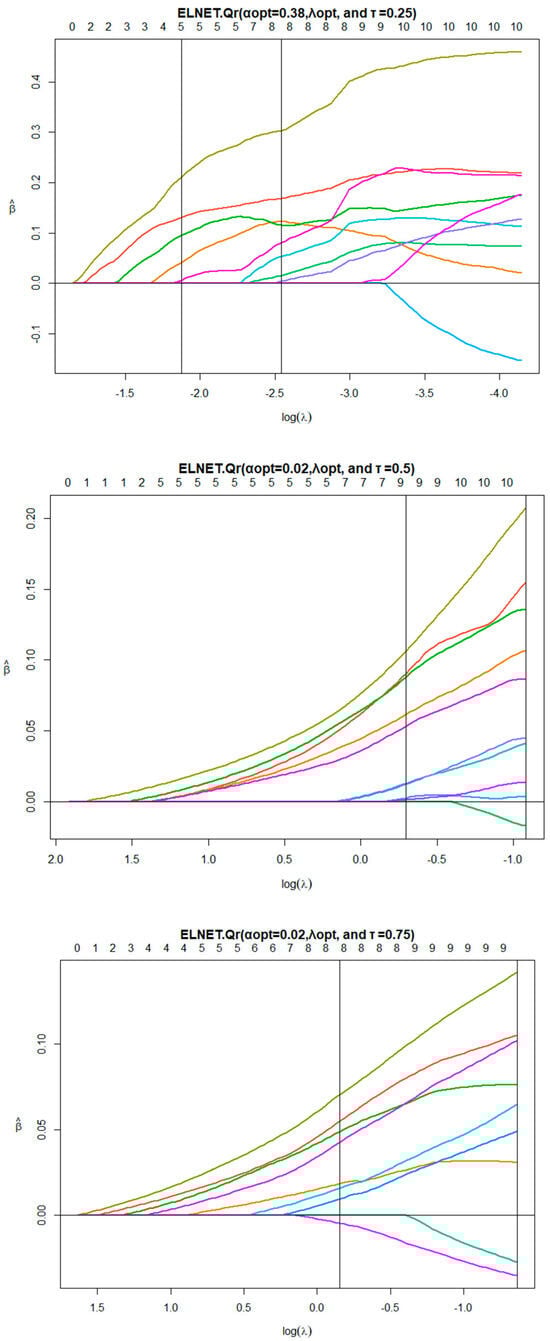 Figure 5 illustrates the relationship between and the selected nonzero coefficient estimation in the ELNET.QR αopt(and at current λ, which represents the actual degrees of freedom. All methods have regularization and variable selection. In each one of the figures from right to left, the estimation of the coefficients decreases toward zero with the increase in the value and forces it to become zero for the unnecessary coefficient estimation (i.e., then the estimated coefficients). For instance, at , the ELNET.QR as the method selected eight nonzero coefficients at and five nonzero coefficients at with different significant strengths.