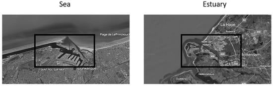We used satellite images from Google Earth to determine the port access to the sea, by assessing for each port if it is located on the seafront or in an estuary, which is the transition zone between river environments and maritime environments, as shown in Figure 2.