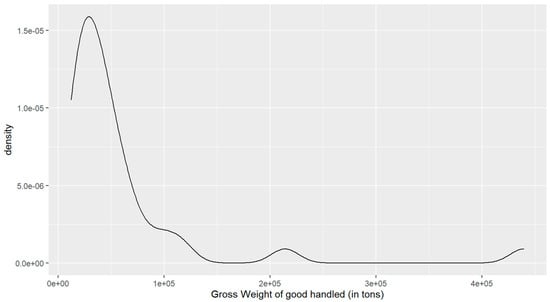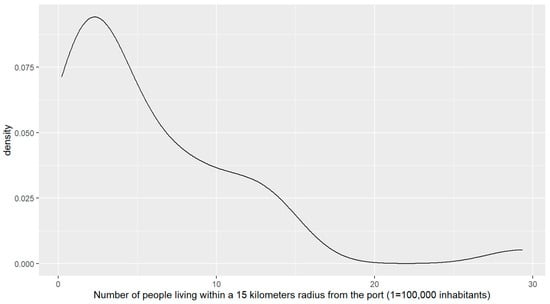 In terms of port size, four cargo and containers ports—Rotterdam, Antwerp, Hamburg, and Amsterdam—handle 25% of the European Union traffic, which represented 44.8% of the containers and cargo handled by the sample. On average, the ports in our sample handled 59,122 tons of goods in 2019, with a standard deviation of 78,792. Figure 6 shows that the density distribution of the port size is right skewed. Therefore, we used a logarithmic scale to analyze the correlation between the size variable and the other variables.