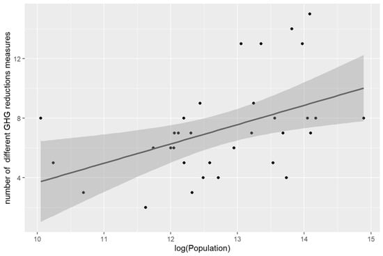On average, 587,503 people live within 15 km of the 33 busiest European ports, with a standard deviation of 600,676 inhabitants. Figure 5 shows that the density distribution of the population living within a 15 km radius of the ports is a right skewed, i.e., it is a lognormal distribution. Therefore, we used a logarithmic scale to analyze the correlation between the population variable and the other variables. This transformation allows for a better understanding of the relationship between population density and the adoption of green measures.