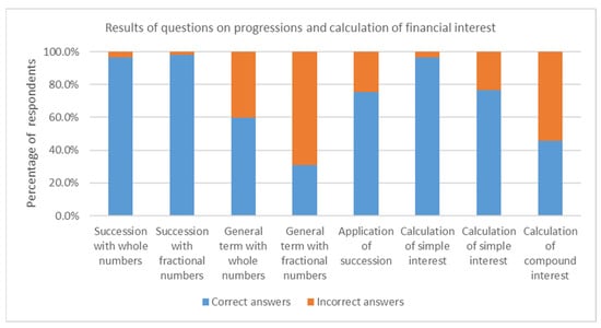 The competence a person must have to effectively calculate interest rates and to understand interest capitalization is essential for financial decision making (Lusardi 2019; OECD 2019c), and people with a low level in arithmetic tend to have less financial knowledge (Lusardi 2012). The empirical results of this research show the importance of arithmetic and geometric progressions for the calculation of financial interest. In our descriptive results, around 97% of university students answered the question related to the sequence of whole numbers and fractional numbers correctly. It is a high percentage, although it should be considered that the participants in the study took a mathematics course the previous semester, in which they reviewed these concepts. The result coincides with Minggi et al.’s (2022) findings but differs from the 47% reported by Khaoula et al. (2020). In our results, 59.8% of university students formulate the general expression of an arithmetic sequence correctly, and less than a third (30.9%) formulate it correctly for fractional terms. The previous results show that students know the difference between the concepts of arithmetic and geometric sequences but have difficulties expressing the general term like in Bajo et al. (2019), Minggi et al. (2022) and Rachma and Rosjanuardi (2021).