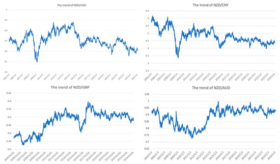 Due to the changes in the exchange rate being impacted by multiple aspects, they display diverse characteristics of change. We selected four representative currencies, USD, GBP, CNY, and AUD, as training and test samples because of their significant impact on the global economy, widespread usage in international trade, and substantial influence on foreign exchange markets. These currencies are representative of major economic regions, providing a comprehensive and diverse dataset for robust predictive modeling. The datasets of NZD against these four currencies are all from Yahoo! Finance (