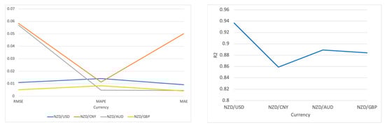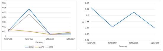Table 3 show that the predictions for NZD/USD are the best, with shallow RMSE, MAPE and MAE values 0.0045, 0.0055 and 0.0035, respectively, revealing that the predicted values are very close to the actual values. The high