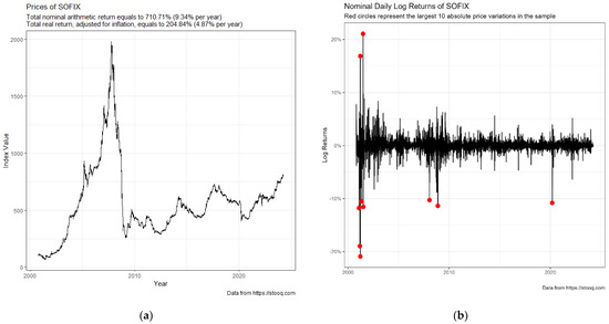 Prices and returns of the SOFIX index (2000–2024). Source: derived by the authors using adapted codes in R proposed in the publication of Perlin et al. (2021) and available for download on GitHub (https://github.com/ip4-2023/garch-sofix/, accessed on 23 June 2024). All price data are in the daily frequency, covering the period between October 2000 and March 2024. In (a), we use the consumer price index and the inflation benchmark to calculate real returns in the period. The red circles in (b) indicate the largest 10 absolute (positive or negative) price changes found in the sample of log returns. Figures can be replicated using the R script 02-Do_Descriptive_Figures_SOFIX.R.