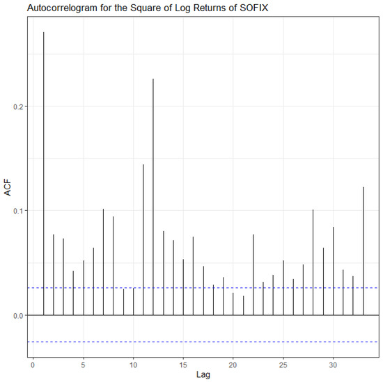 As can be seen from the results presented in Table 3, all the tests conclude that the SOFIX series are stationary with respect to the first differences. In terms of levels, ADF, PP and ADF-GLS confirm stationarity, while with KPSS, it is assumed that a unit root is present. Since the two criteria (ADF and PP) where the null hypothesis assumes that there is a unit root have problems in terms of their power, i.e., the null hypothesis is not true, but it is not rejected, and in this case, the situation is reversed, the log returns were used as the basis for estimating the conditional mean and variance equations. This conclusion is confirmed by the ADF-GLS test, in which the power problems are absent.