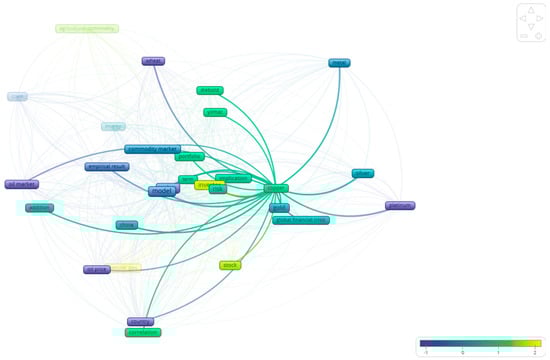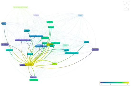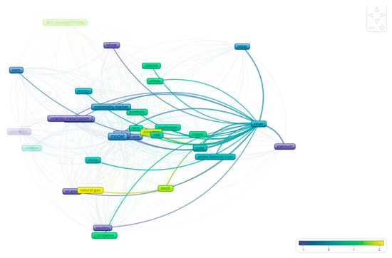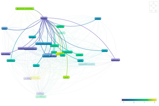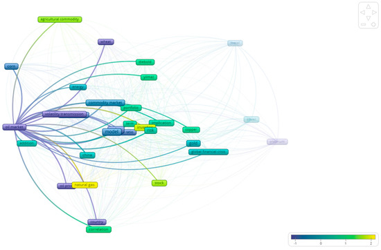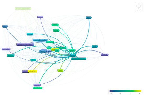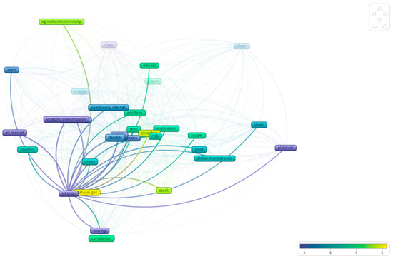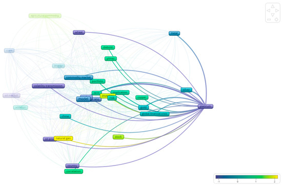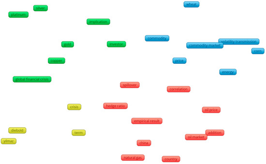 As already discussed, this study elaborates on the literature concerning the relationship between the volatility of different assets. As a first step, we used VOSViewer, 1.6.20 which enabled us to find the examined relationships that exist in the bibliography between the different commodities. As Figure 3 shows, there are four distinct clusters in the studies included in this paper. In particular, the majority of the studies study agricultural commodities in relation to the energy markets (blue color). In a similar manner, the bibliography focuses on the relationship between hard commodities (like gold, platinum, silver etc.), as observed by the green color in the figure. Following this mapping, the remainder of this section examines more closely, at the commodity level, the relationships that appear in the bibliography.