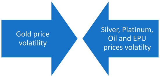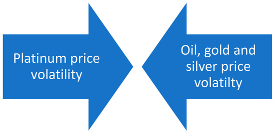 In summary, after analyzing the behavior of the precious metals market, it is worth investigating the price of platinum. Its characteristic is that the platinum market interacts with the price of oil, gold, and silver. Specifically, when analyzing the period since the 1990s, the literature reveals that the platinum and oil markets are affected in both directions, as can be understood from Figure 15 (Behmiri and Manera 2015; Reboredo and Ugolini 2016; Tiwari et al. 2021). Additionally, gold and platinum have a similar relationship. In detail, the volatility of the price of one precious metal results in the volatility of the market of the other.