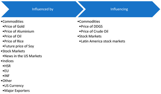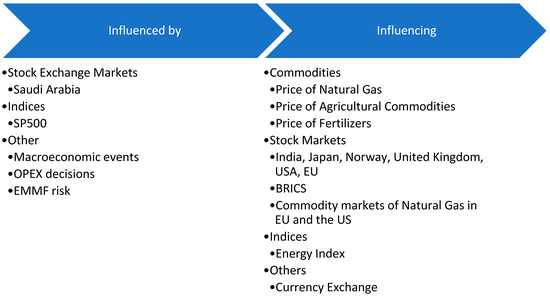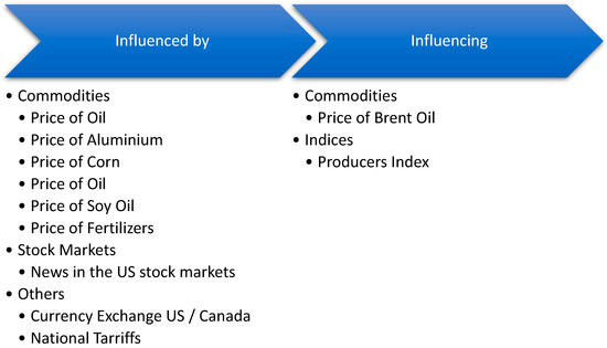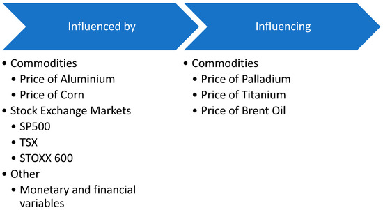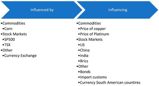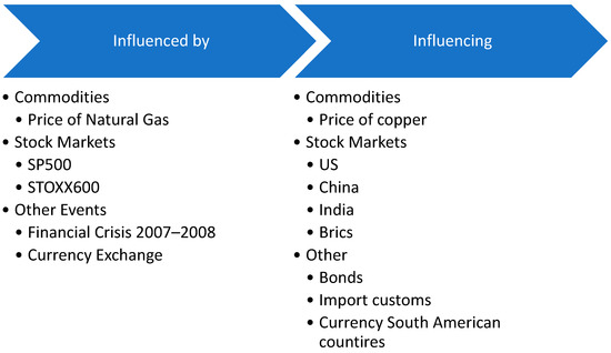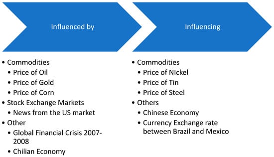 Nevertheless, it is worth noting that the copper market is suitable for further research. Thus, one of the important gaps that arise in this particular literature study is the correlation of the copper market with the volatility of certain indicators (see Figure 14). Considering that modern studies deal with the interaction of metal markets, specifically with copper, the existence of a relationship between the price of copper and stock market indices is considered worthy of investigation. Also, the relationship between copper and agricultural products is under-researched. Thus, future literature can shed light on this aspect.