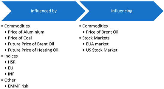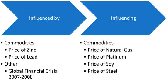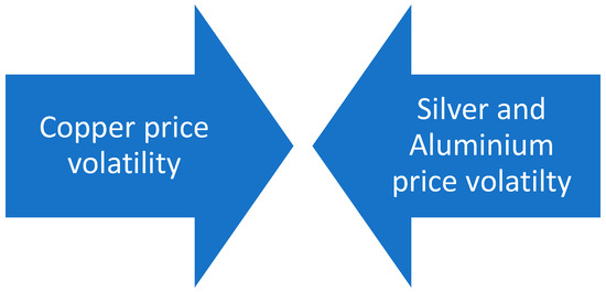 However, the relationship of copper with other commodities is of particular interest. Various researchers have dealt with the effect of the price of various goods on the market volatility of the metal in question. As shown in Figure 13, oil is one of the commodities that obviously affects the price of copper, especially when investigating the period since the 1990s and the Chinese metal market in particular (Behmiri and Manera 2015; Reboredo and Ugolini 2016; Zhang and Tu 2016). In addition, volatility in the price of copper occurs due to the volatile behavior of the gold market. Specifically, the literature notes that for about 30 years, the unstable price of gold worldwide resulted in the volatility of the copper market (Oliyide et al. 2021). It is necessary to point out that aluminum and silver behave in a bidirectional manner with the specific metal, as shown in Figure 13. In particular, aluminum and copper show a strong interaction (Chevallier and Ielpo 2013; Hu et al. 2020). At the same time, the volatility of the price of corn has an effect on the price of copper, which seems to change during the investigation of the years 1992–2015 (Chevallier and Ielpo 2013).