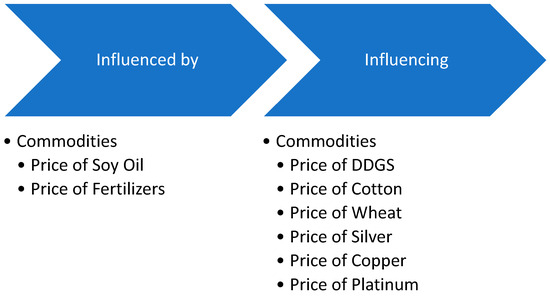 Silver, like any precious metal, exhibits a strong correlation with a variety of commodities, as shown in Figure 7. Of particular importance is the effect of oil on it. The literature reports that sudden changes in the price of oil have a direct effect on the volatility of the price of silver during the period 1993–2015 in international markets (Behmiri and Manera 2015; Reboredo and Ugolini 2016). Additionally, the relationship of all precious metals to silver is important. In particular, the researchers, when examining the period 1986–2015, noted that almost all metals (Batten et al. 2010; Reboredo and Ugolini 2015) influence silver. However, the strongest interaction appears to exist between gold, aluminum, and silver over the last 30 years (Antonakakis and Kizys 2015; Chevallier and Ielpo 2013; Dutta 2018; Uddin et al. 2019; Umar et al. 2021). In addition, silver is correlated with the price of an agricultural product, corn. It is reported in the literature that the volatility of the price of this agricultural product had significant effects on the silver market (Chevallier and Ielpo 2013).