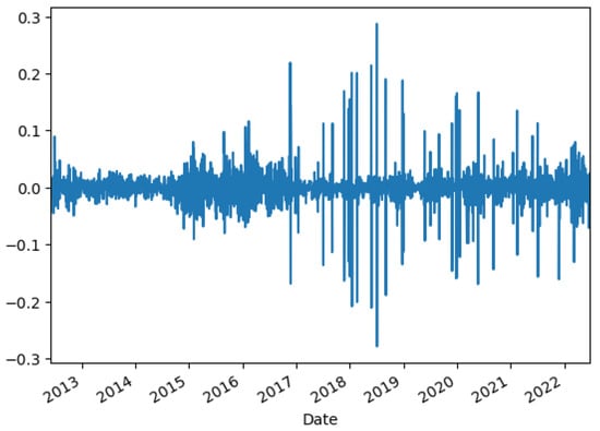 Brent oil prices with daily frequency were obtained from the Investing website2, a public domain data warehouse. The time interval spans from 5 June 2012 to 27 June 2022, comprising 2643 observations. The target variable, volatility, was derived from daily Brent oil price returns. We allocated 80% of the data for training and the remaining 20% for testing.
