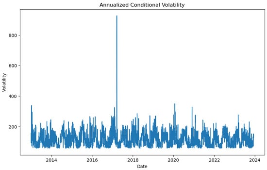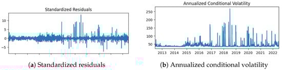 The Generalized Autoregressive Conditional Heteroskedasticity (GARCH) is a widely used model for capturing volatility clustering in financial time series data. It models the conditional variance of a time series as a function of its past values and past squared errors (see (), (), (), and ()). Let be the mean corrected stock and let