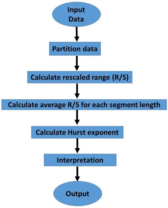 Let the time series be of length N, which is subdivided into equal subintervals so that the total length can be represented as , where n is the number of sub-time periods. The following algorithm demonstrates the working mechanism of rescaled range analysis to achieve the Hurst exponent for a given time series.
