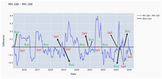 When crosses downward through , it indicates a potential buying opportunity, suggesting reduced chaos. Conversely, when crosses upward through , it may signal a selling opportunity, indicating increased chaos (see Figure 2). Further, we implement a basic MA strategy with the same window sizes, i.e., 100 and 150. Then, we compare returns evaluated based on the metric that is defined in Section 4.1. Our intention is to comparatively perform better in MH returns than MA returns, proving to be a replacement in certain ensemble strategies where MA is being used traditionally.