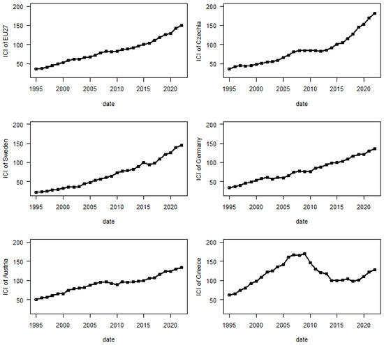 Time series plots of the information and communication industry (ICI) index for the 27 members of the E.U., Czechia, Sweden, Germany, Austria and Greece.