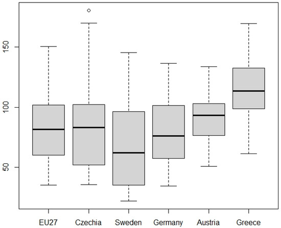 Box plots of the information and communication industry (ICI) index for the 27 members of the E.U., Czechia, Sweden, Germany, Austria and Greece.