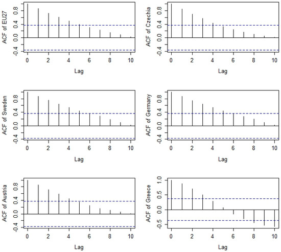 Model selection requires the identification of the parameters p, d, and q and minimizing of information criteria such as Akaike’s Information Criterion (AIC), as described in Hyndman and Khandakar (2008). The visualization of the development of the ICI in Figure 1 shows a trend for the ICI time series of 27 members of the E.U, Czechia, Sweden, Germany and Austria, whereas there is no such evidence for the ICI time series of Greece. Moreover, the plot indicates a lack of stationarity, especially for the first five, as the time series does not show a constant mean over time. Additionally, the autocorrelation function (ACF) of the time series of all entities, depicted in Figure 3, shows a very slowly decaying of the ACF of the 27 members of the E.U., Czechia, Sweden, Germany and Austria, indicating non-stationarity, whereas the correlogram of Greece implies an AR component in the model that will be selected.