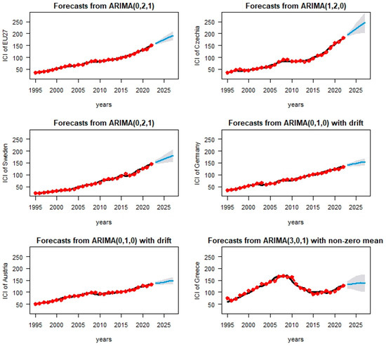ARIMA fitted models and forecast of the ICI index for the 27 members of the E.U. (θ1 = −0.6279), Czechia (φ1 = −0.5167), Sweden (θ1 = −0.8226), Germany (c = 3.7811), Austria (c = 3.0755) and Greece (φ1 = 1.8759, φ2 = −0.9508, φ3 = −0.0038, θ1 = 0.7607 and c = 9.4255).