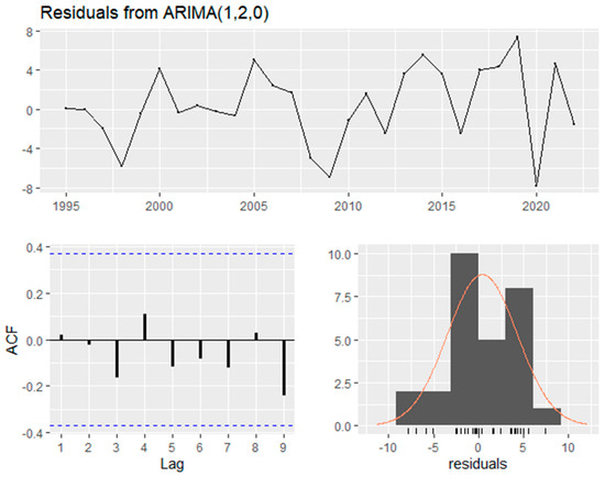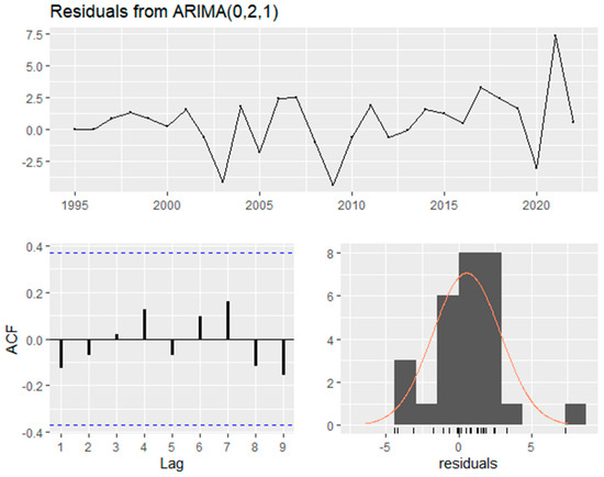 Additionally, the time series plot of the residuals, their ACF correlogram and the histogram of the residuals for the average of 27 members of the E.U. (with an MA component), Czechia (with an AR component), and Greece (with AR and MA components) are presented in Figure 5, Figure 6 and Figure 7, respectively. In all cases, there is no evidence of autocorrelation, and the residuals do not have a significant deviation from mean zero and constant variance, implying the appropriateness of the fitted models.