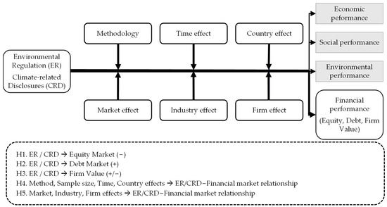 The impacts of new regulations on firms’ economic, social, and environmental performance have a certain time lag (Porter 1990), where financial markets immediately react to new information based on the efficient market hypothesis EMH (Fama 1970). Therefore, we focus on the effects of ERs and CRD on the financial performance of equity, debt, and firm value in our study. The impacts of environmental regulation and climate-related disclosure on the financial markets may be limited by a variety of factors such as methodology and risk-related factors. For example, using a study sample from a developed or developing market determines the significance and magnitude of the relation between a climate-related regulation and financial performance (Horváthová 2010). Industry risks are important because different industries are exposed to different types of risks caused by changes in government policies (Rassier and Earnhart 2010). We adopt a meta-analytic approach to further explore the impact of ER/CRD on financial markets and hypothesize the following relationships: